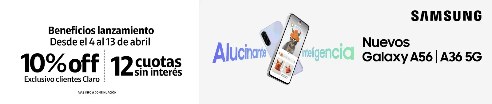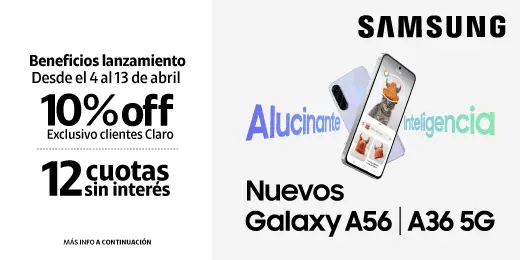 Durante el lanzamiento, Claro pone a tu alcance una oportunidad única para adquirir los Galaxy A36 y A56 con condiciones preferenciales. Accedé a cuotas fijas sin interés, envío a todo el país, y promociones especiales para quienes ya cuenten con servicios de Claro. Además, podés gestionar tu compra 100% online y recibir asistencia personalizada en cada paso.