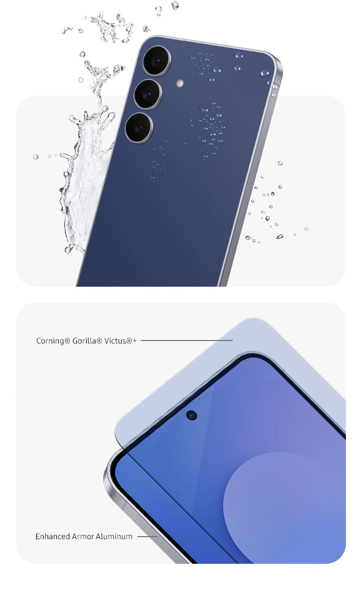 Con Corning® Gorilla® Glass Victus®+ y un marco de Armor Aluminum reforzado, el Galaxy S25 FE está fabricado con materiales prémium y resistentes. También cuenta con certificación IP68 para resistencia al polvo y al agua, para que encares tu próxima aventura con confianza.6