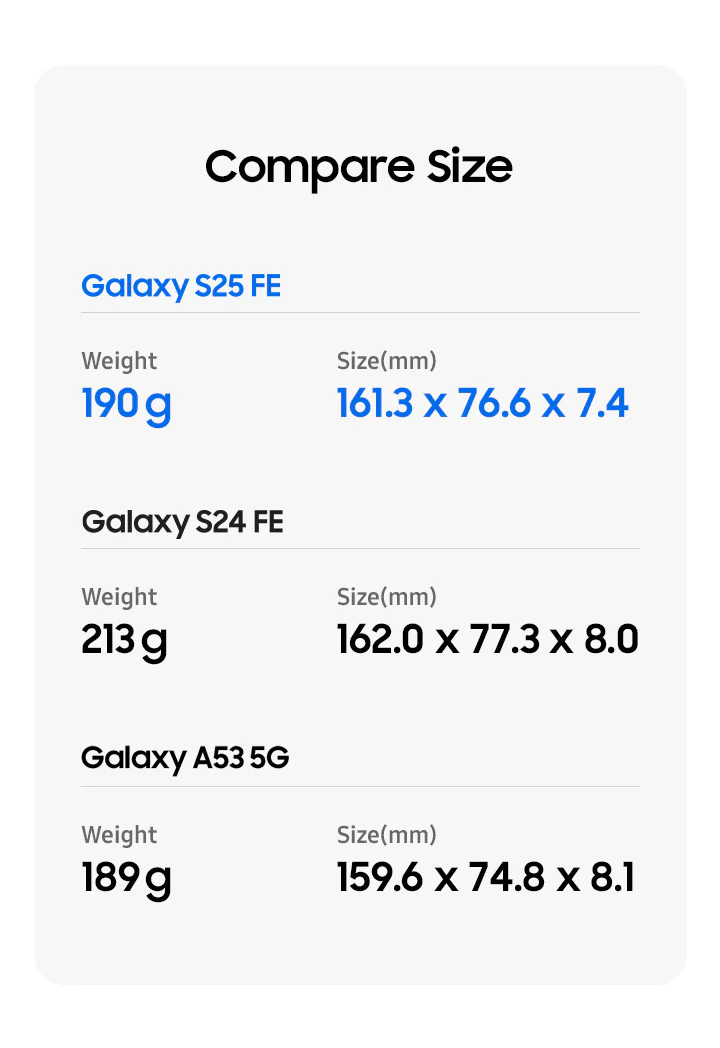 Con 7,4 mm y 190 g, el Galaxy S25 FE es el FE más fino y liviano hasta ahora. Sus biseles ultra delgados y la cámara flotante le dan un diseño sofisticado y una experiencia visual inmersiva. Llevá menos, disfrutá más.4